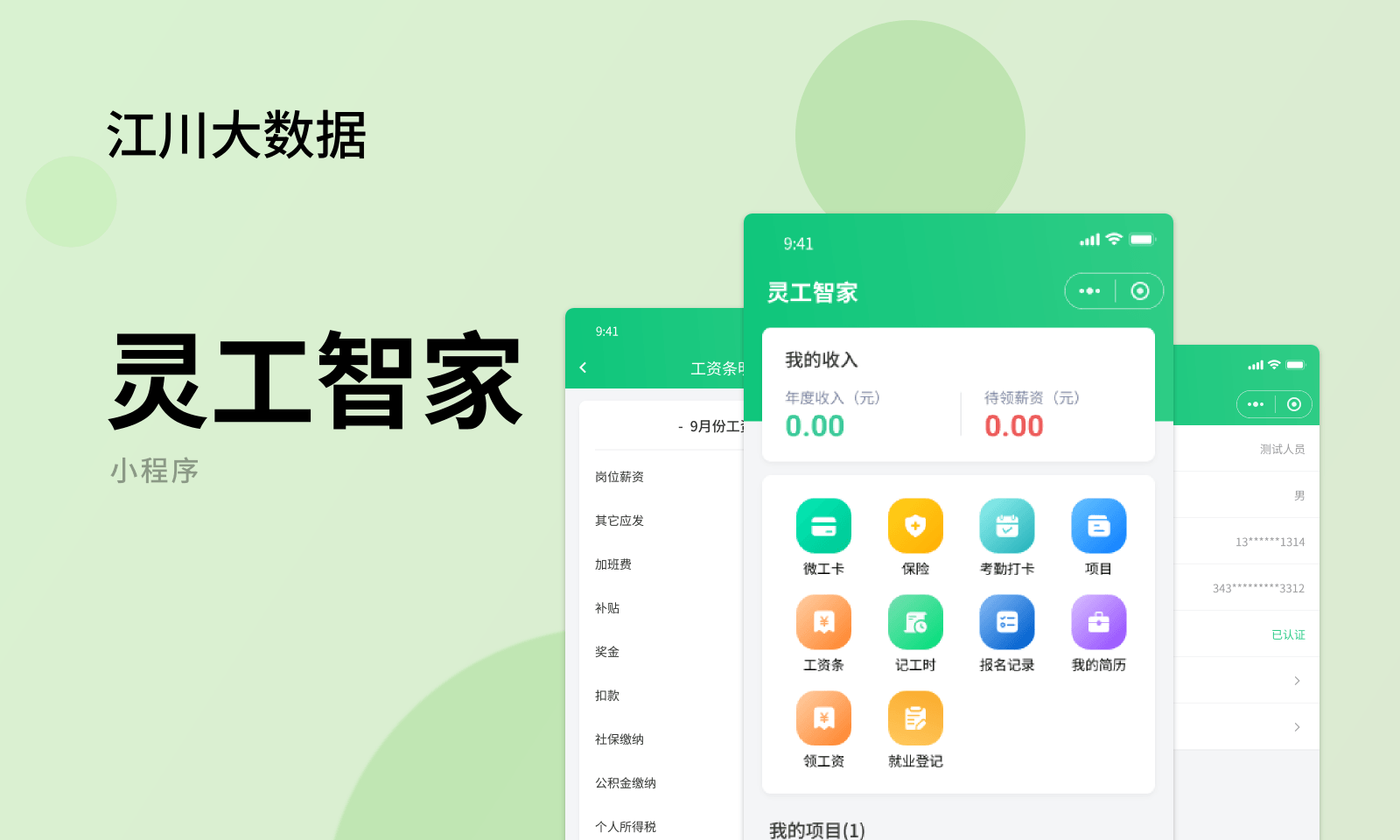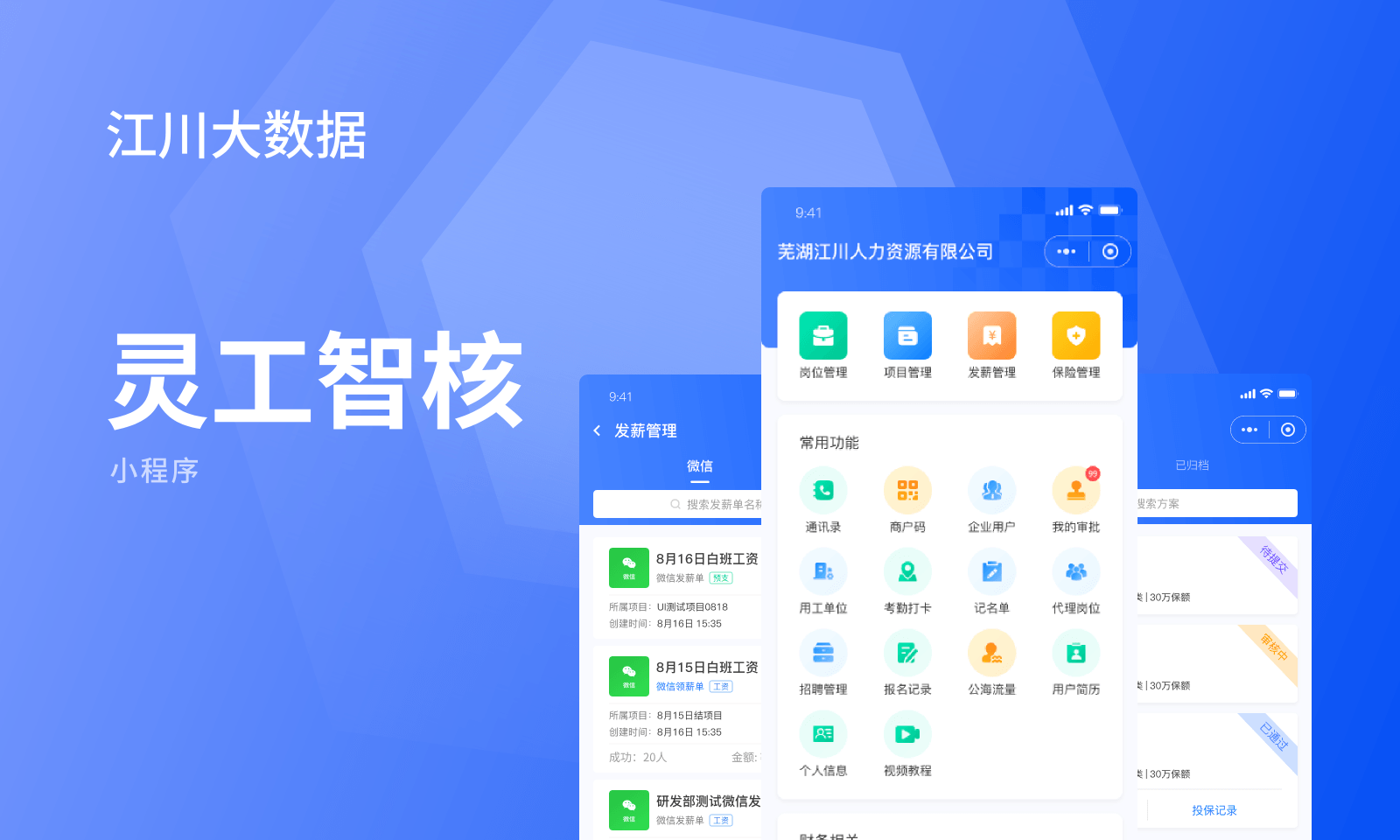 灵工智核小程序是芜湖江川大数据自主研发的一站式灵活用工数字化管理工具,面向人力资源公司、用工企业与灵活就业群体,提供项目管理、员工入离职、合规薪酬发放、在线保险投保、人员统筹全流程线上化服务。